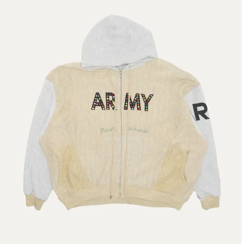 Upgrade your streetwear with the Beige Satoshi Nakamoto Army Rhinestone Hoodie. The beige body pairs with light grey sleeves and hood for a clean contrast. On the chest, “ARMY” pops in colorful rhinestones, while “Satoshi Nakamoto” is embroidered beneath in subtle script.