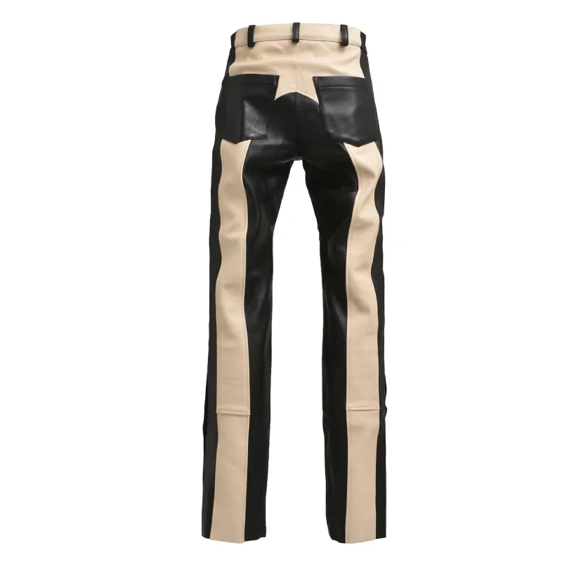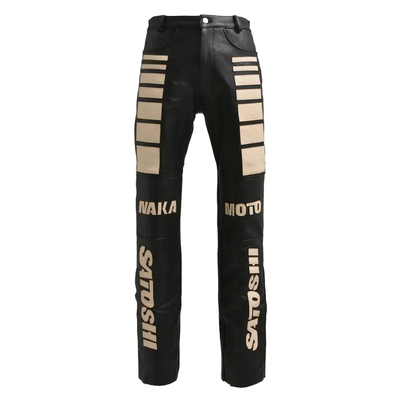 Our Black/Off White Satoshi Nakamoto Leather Moto Pant fuses rugged edge with timeless polish. The fit is slim but easy, giving you a clean silhouette without losing mobility. A secure zip-and-button closure keeps it locked in place, while side and back pockets add practical function without breaking the look.