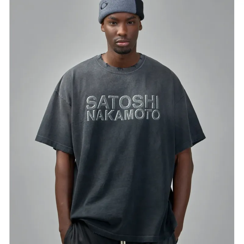 Elevate your streetwear rotation with our Black Satoshi Nakamoto Shadow Logo Tee. It’s crafted from 100% premium cotton, this shirt features a unique vintage-inspired wash in a deep charcoal black. The standout design element is the embossed ‘Satoshi Nakamoto’ text, adding subtle texture to the chest.