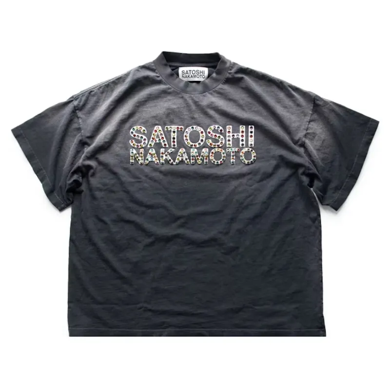The Black Sicko x Satoshi Nakamoto Studded Logo Tee is the ultimate statement piece for crypto and streetwear lovers. This exclusive, limited-edition graphic t-shirt features the iconic Satoshi Nakamoto pseudonym, brilliantly rendered in eye-catching, premium silver metal studs on a deep black canvas.