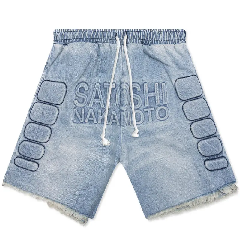 We designed our Blue Denim Satoshi Nakamoto Denim Moto Shorts to fuse rugged style with everyday comfort. Cut from 100% cotton, these shorts feature a classic 4-pocket layout, elastic waistband with adjustable drawstrings, and raw frayed hems for a worn-in edge. We added padded seam detailing to give structure and a moto-inspired attitude, while our embossed Satoshi Nakamoto branding across the front adds a bold, layered finish. Whether you’re on the move or keeping it lowkey, these shorts bring the perfect mix of function and statement.