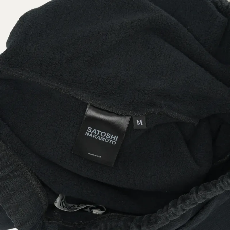 Step into bold comfort with our Destroyed Black Satoshi Nakamoto Star Studded Sweatpants. It’s destroyed black cotton feels lived-in and cool. Stars made from studs and Satoshi embroidery line the legs—eye-catching but refined. We added a drawstring elastic waist and elastic cuffs for a chill, stay-put fit.