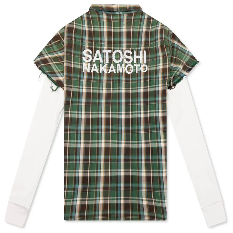 Green Plaid Satoshi Nakamoto Bender Cut Off Flannel Shirt