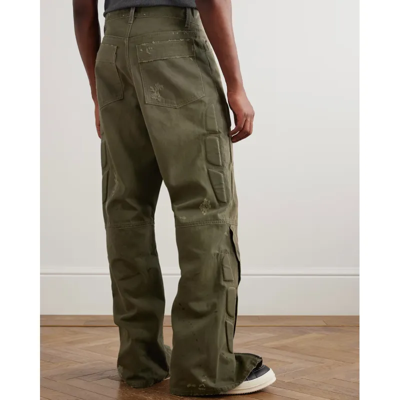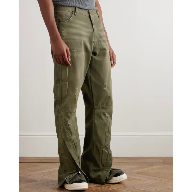 Faded green cotton denim keeps it rugged yet wearable. We added side zips so you can switch the fit—tight or relaxed, your call. These jeans aren’t just built to stand out; they’re built to move with you.