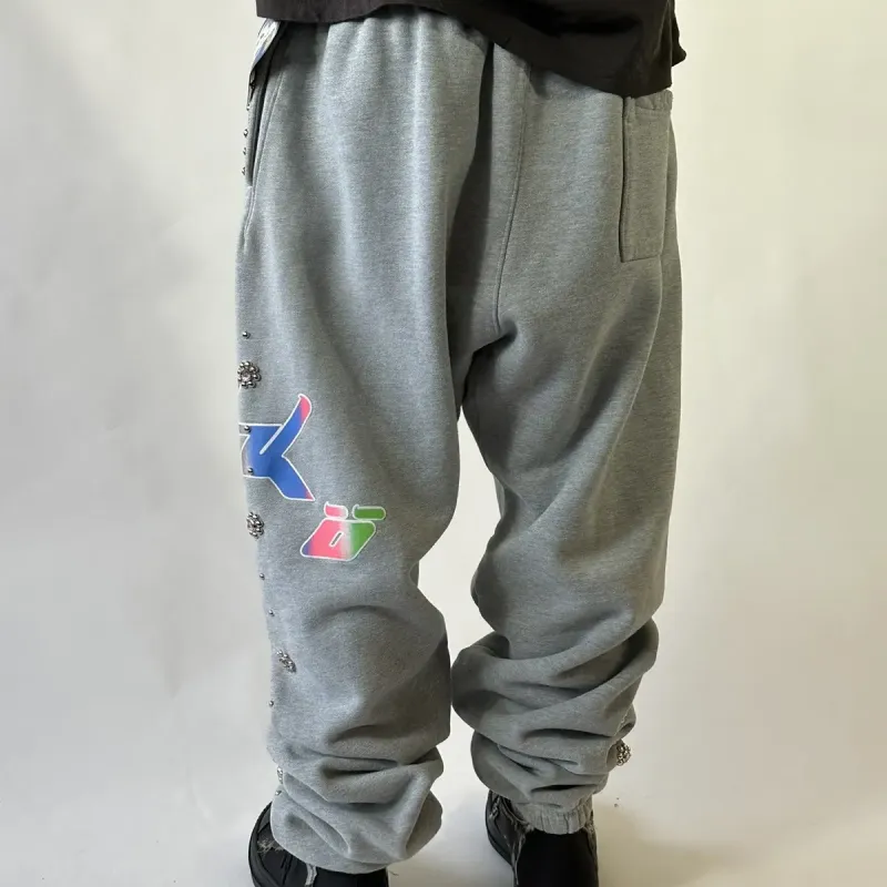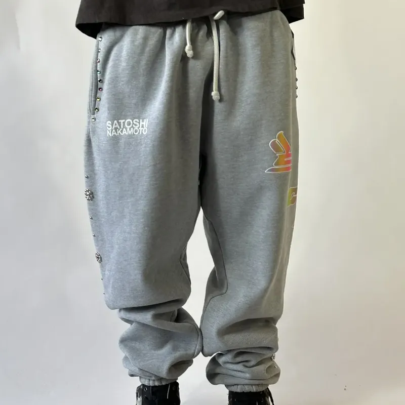 Break the ordinary with our Grey Satoshi Nakamoto Tie Dye Collab Sweatpants. We built them from premium cotton with a bold grey tie-dye finish for a unique street vibe. Multicolor Sicko print adds a loud statement, while studded accents bring an unexpected edge. Deep side and back pockets keep your essentials secure without compromising style. A relaxed fit and elastic waistband ensure comfort for every move. This is not just loungewear—it’s streetwear with attitude.