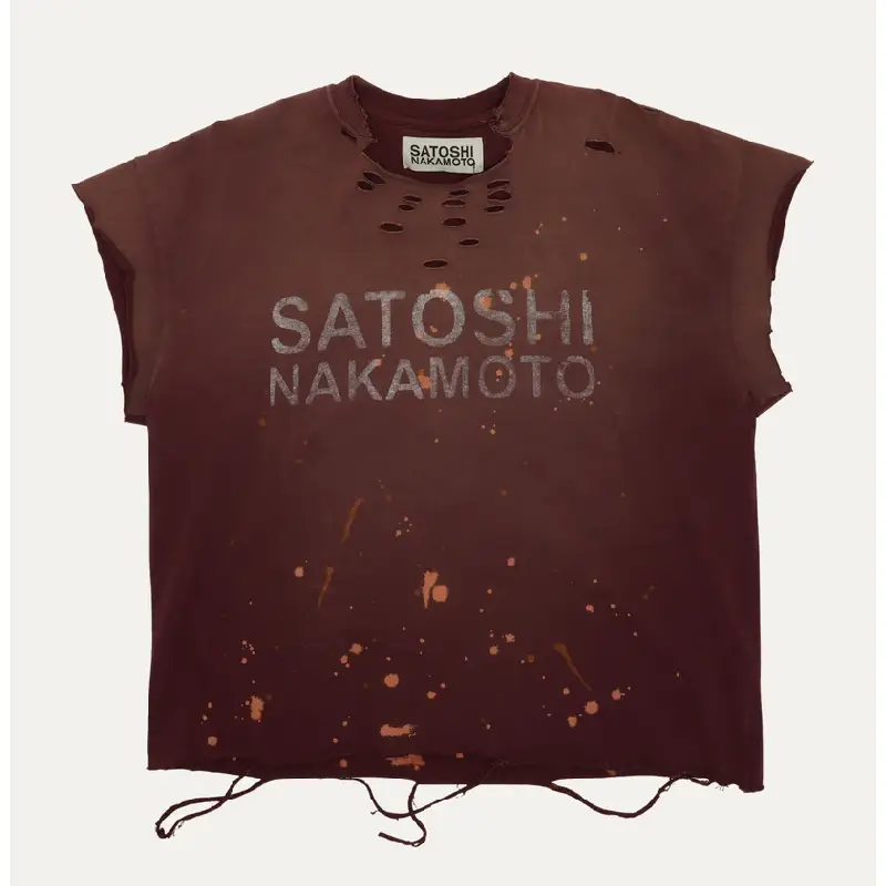 On the front, you’ll find a sharp and clean graphic that nods to Satoshi Nakamoto’s legacy. The back of features a distressed paint-splatter design that feels raw and authentic. Finished with cut-off edges and hanging threads, the design brings an edgy, worn-in vibe.