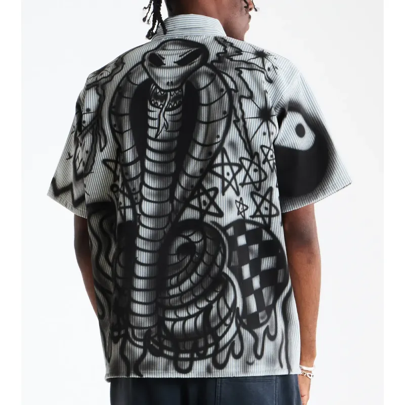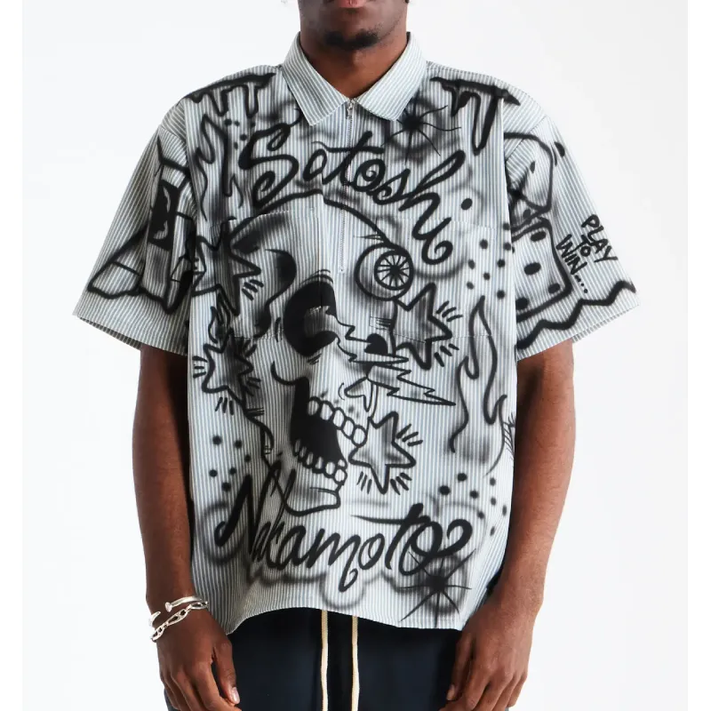The Grey/Black Satoshi Nakamoto Abandoned Theme Park Half Zip blends workwear attitude with street-art energy. This short-sleeved, quarter-zip cotton shirt features light blue and white vertical stripes and an oversized, boxy fit with a structured collar.