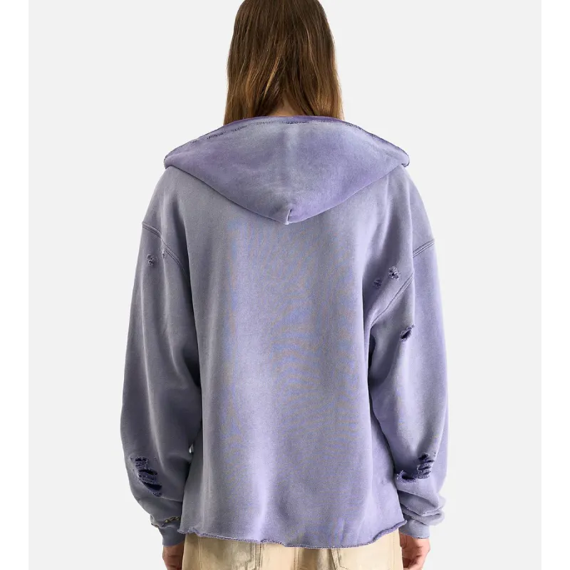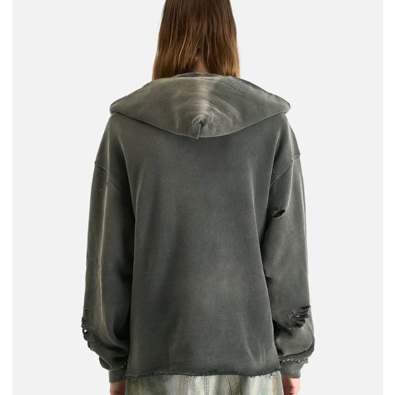 Its rib cuffs keep the fit in place, and subtle wrist details give it a custom edge. A spacious kangaroo pocket adds everyday function. Distressed touches run across the fabric, creating a rebellious finish that’s full of character.