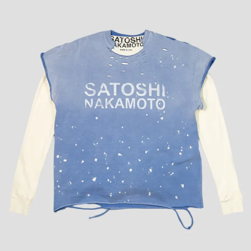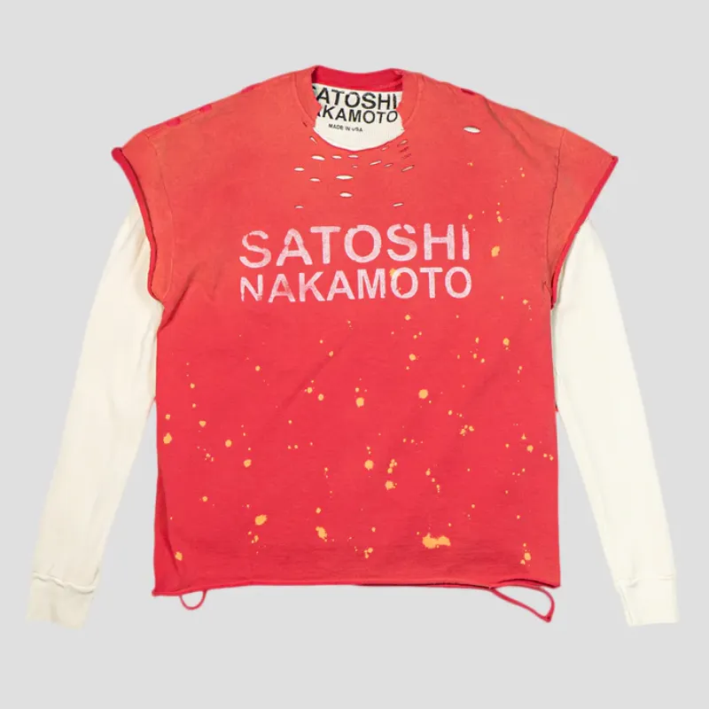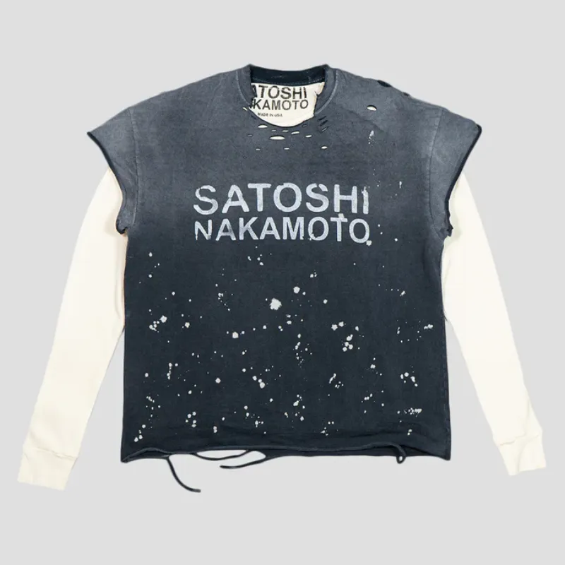 Our Satoshi Nakamoto Luke Thermal T-shirt is crafted to layer with flair. We paired a soft thermal base with a detachable tee for easy style shifts. Distressed holes and scattered paint splatters give it an authentic, worn-in feel. Bold SATOSHI NAKAMOTO print across the chest adds a strong statement without overdoing it. Made from premium cotton, it feels smooth and breathable while keeping a rugged look. This piece brings texture, attitude, and versatility to your rotation.