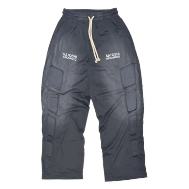 The Satoshi Nakamoto Mesh Moto Lounge Pants combine bold style with ultimate comfort. It’s crafted from breathable mesh, these wide-leg trousers feature a structured, paneled design with signature rectangular padding along the outer legs.