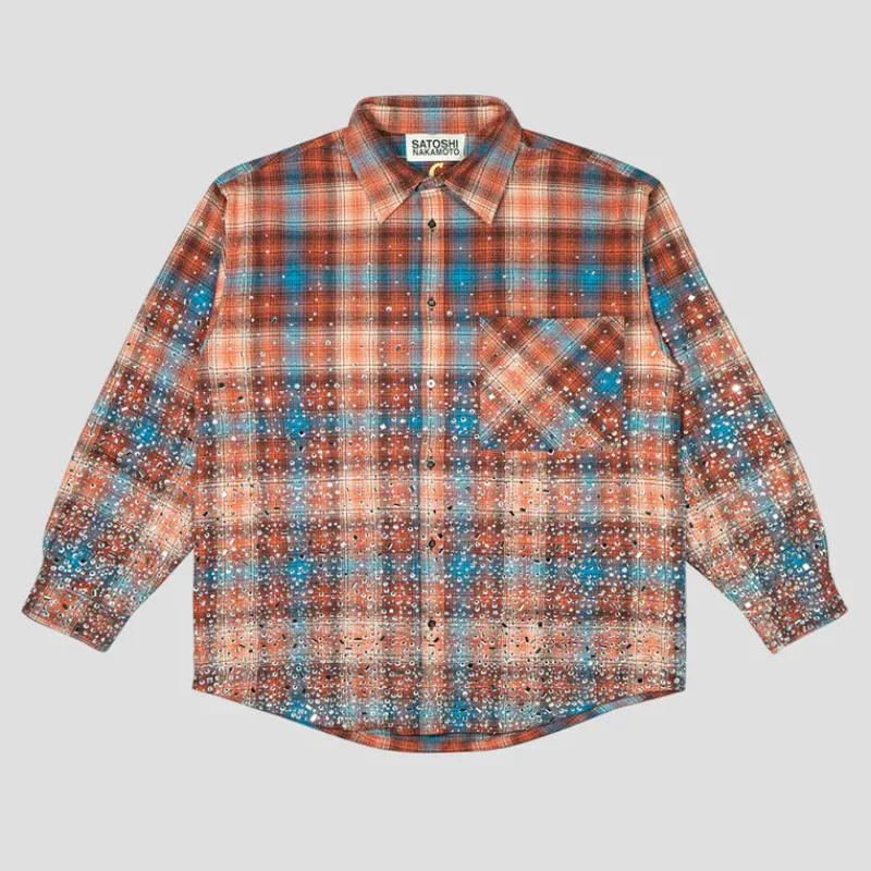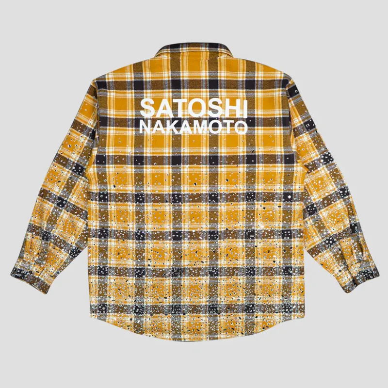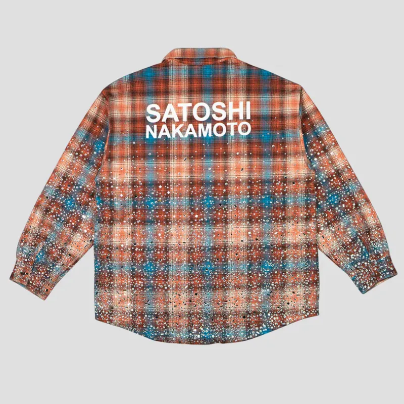 Our Satoshi Nakamoto Shattered Glass Flannel is built to make an impact. We took a classic plaid base and scattered crystal-like accents for a shattered glass effect that shines with movement. The oversized fit keeps it relaxed, while a bold SATOSHI NAKAMOTO hit across the back sets it apart. Soft cotton brings all-day ease, and snap buttons lock in the finish. It’s a flannel that turns heads every time.