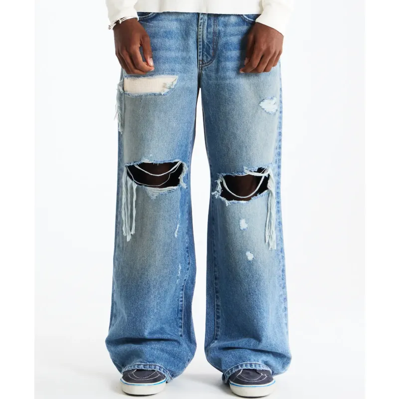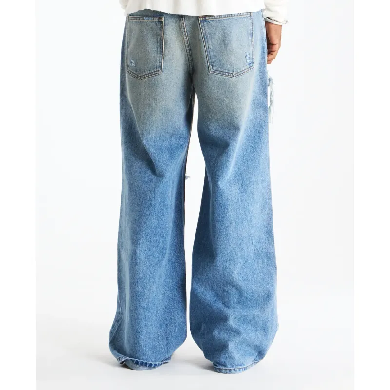 The Washed Blue Satoshi Nakamoto Blessed To Be Stressed Jean delivers an ultra-baggy, wide-leg fit with an oversized puddle hem that stacks at the shoes. It’s crafted from washed blue denim, it features vintage whiskering, light distressing, and bold DIY-inspired deconstruction. Blown-out knees with frayed edges and a rectangular thigh patch add attitude, while the clean five-pocket back highlights dramatic volume, fluid drape, and effortless streetwear appeal.