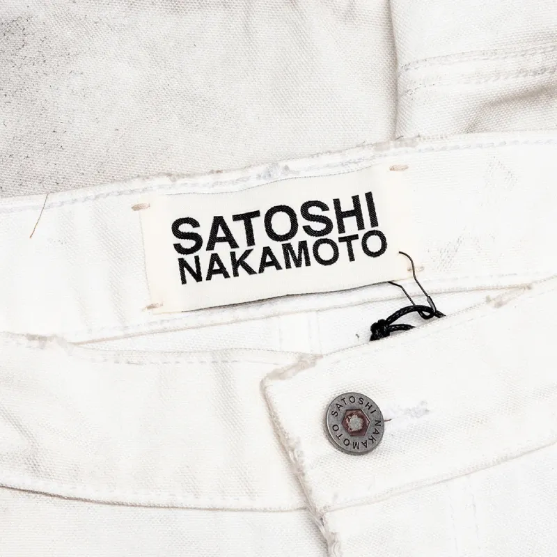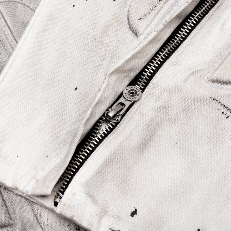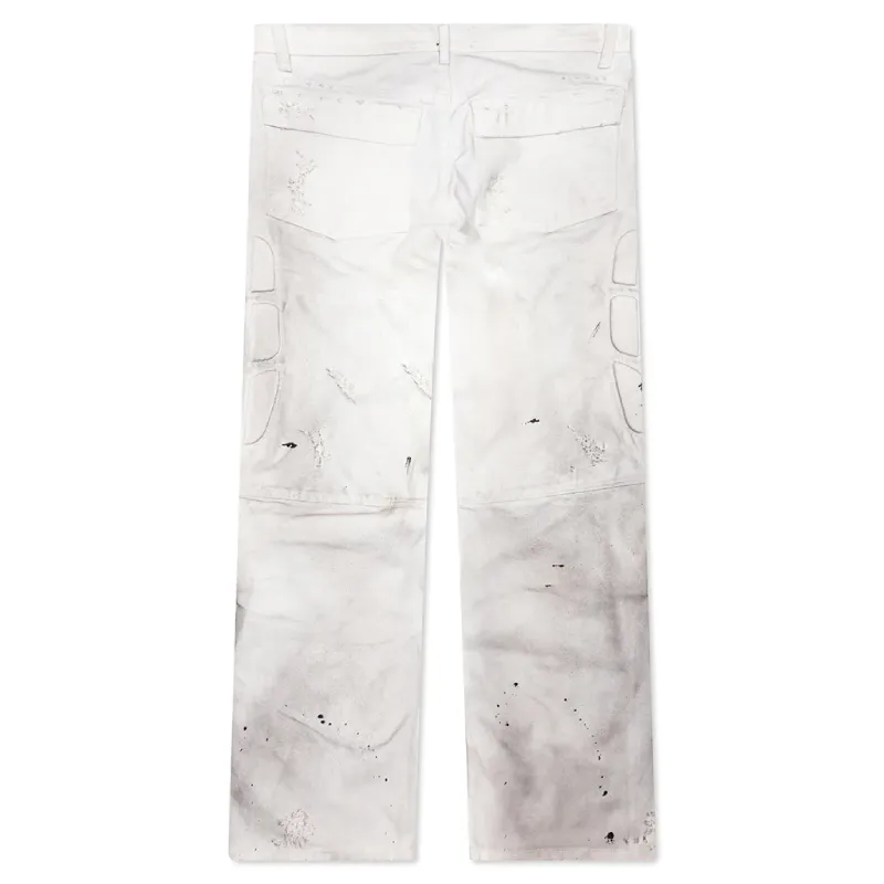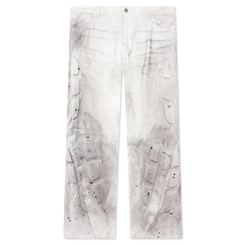 This White Canvas Satoshi Nakamoto Enduro Pant is cut from 100% cotton and finished with rough distressing and hand-applied stains. Geometric padding runs down the outseams for a look that hits different. A 5-pocket layout, zip fly, and button closure keep it functional.
