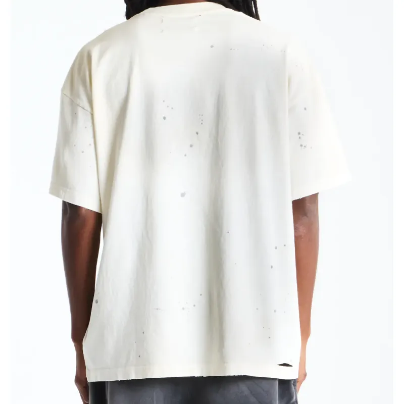 The raw, edgy aesthetic is amplified by hand-distressed details, including subtle nicks at the neckline and paint splatter effects throughout the front and back.