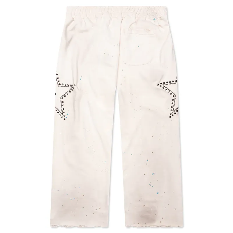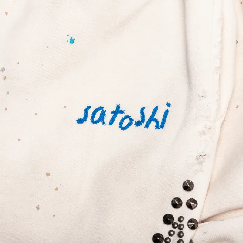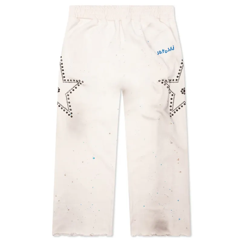 Our White Satoshi Nakamoto Star Studded Sweatpant is built from heavyweight 100% cotton with a bold, lived-in look. Intentional stains, paint splatters, and raw hems give it a worn-in, rebellious feel. The oversized elastic waistband with internal drawcords adds all-day comfort.