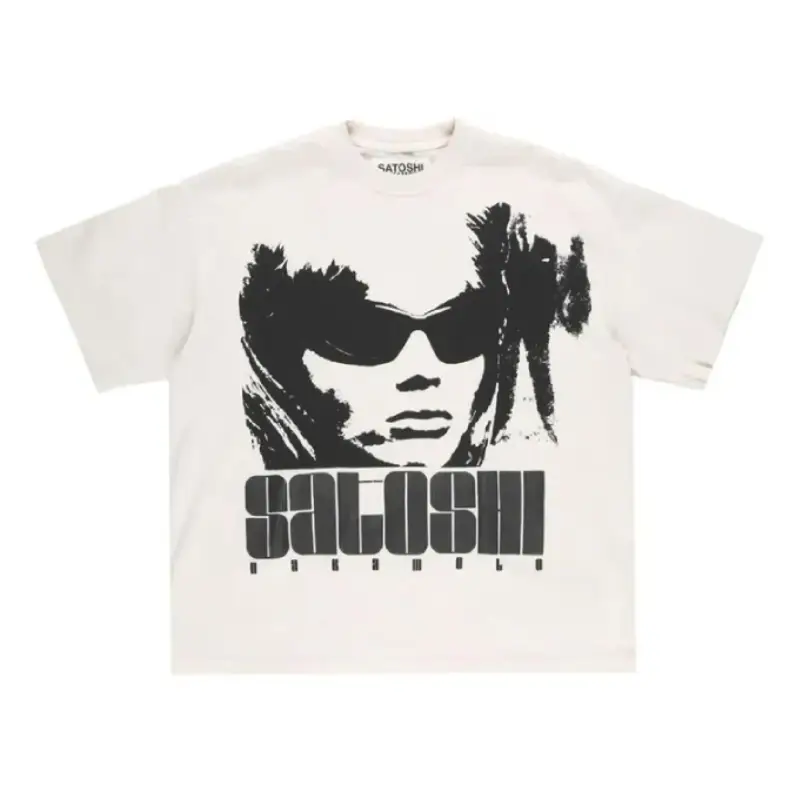 The graphic is a stylized, high-contrast image of a person wearing sunglasses, with the word “SATOSHI” in a large, bold, and futuristic font below it. The name “NAKAMOTO” is printed in a smaller font directly underneath “SATOSHI”. There is also a small branded patch inside the back of the collar.