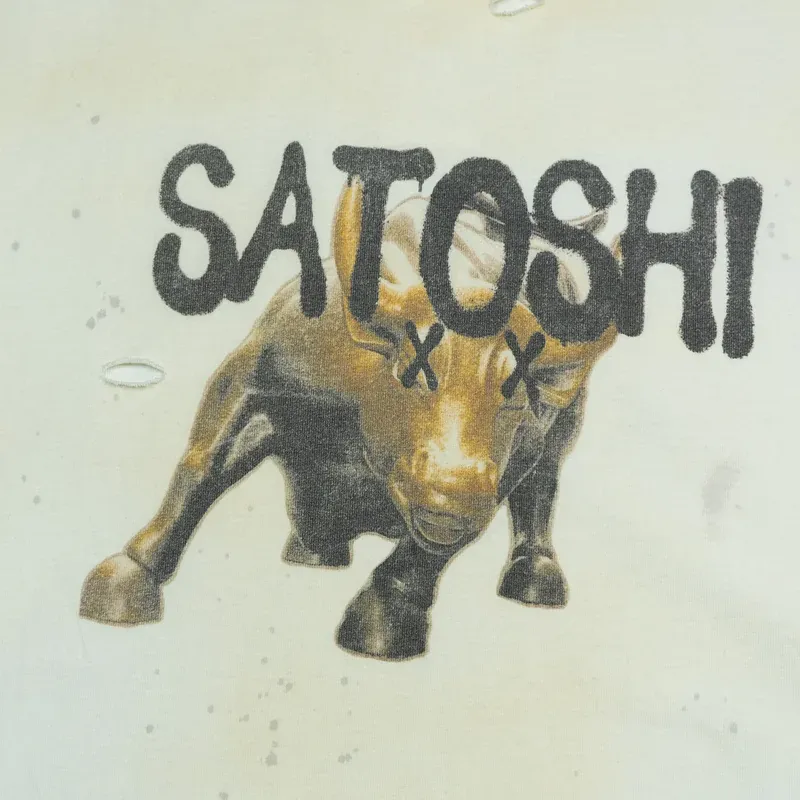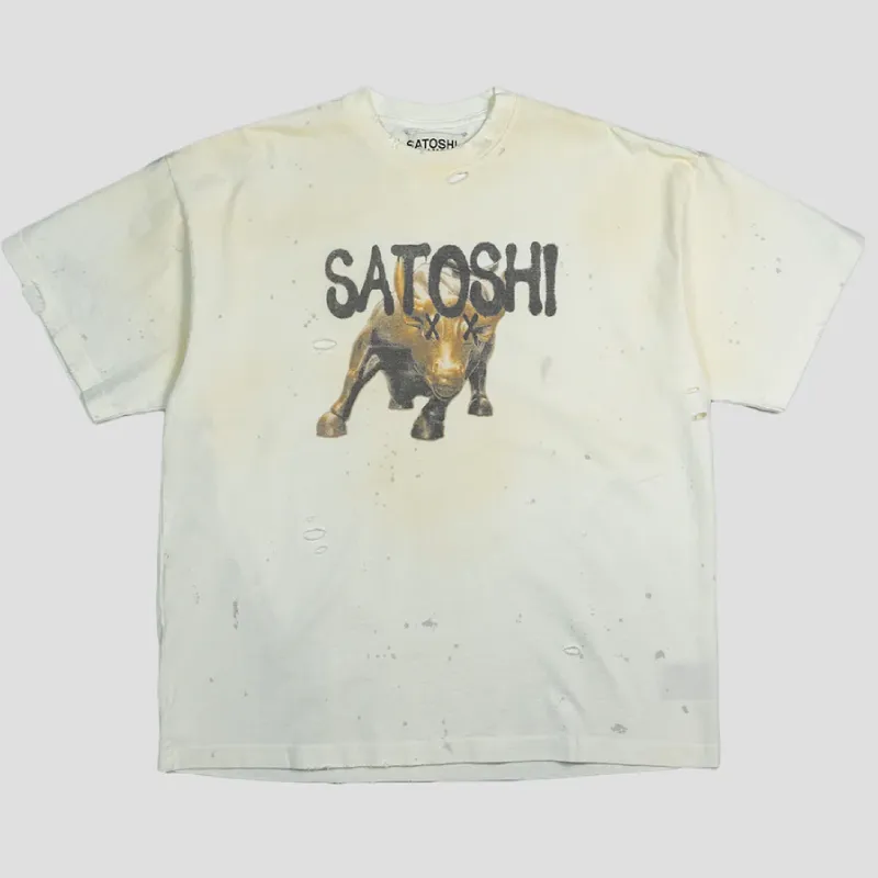 Our White Satoshi Nakamoto Wall Street Tee delivers bold energy with a refined edge. This white-colored, oversized cotton tee features a distressed Satoshi logo and a striking charging bull graphic with X eyes.