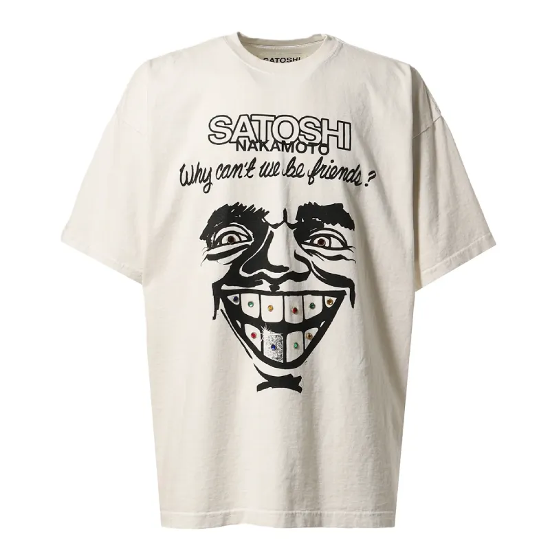 Renew your summer collection with our White Satoshi Nakamoto Why Can’t We Be Friends Tee. The bright white canvas lets the quirky face graphic and handwritten “Why Can’t We Be Friends” line shine loud and clear. Relaxed fit and soft cotton make it feel like your go-to from day one. Wear it, start a conversation, and let your style do more than look good—it opens doors.